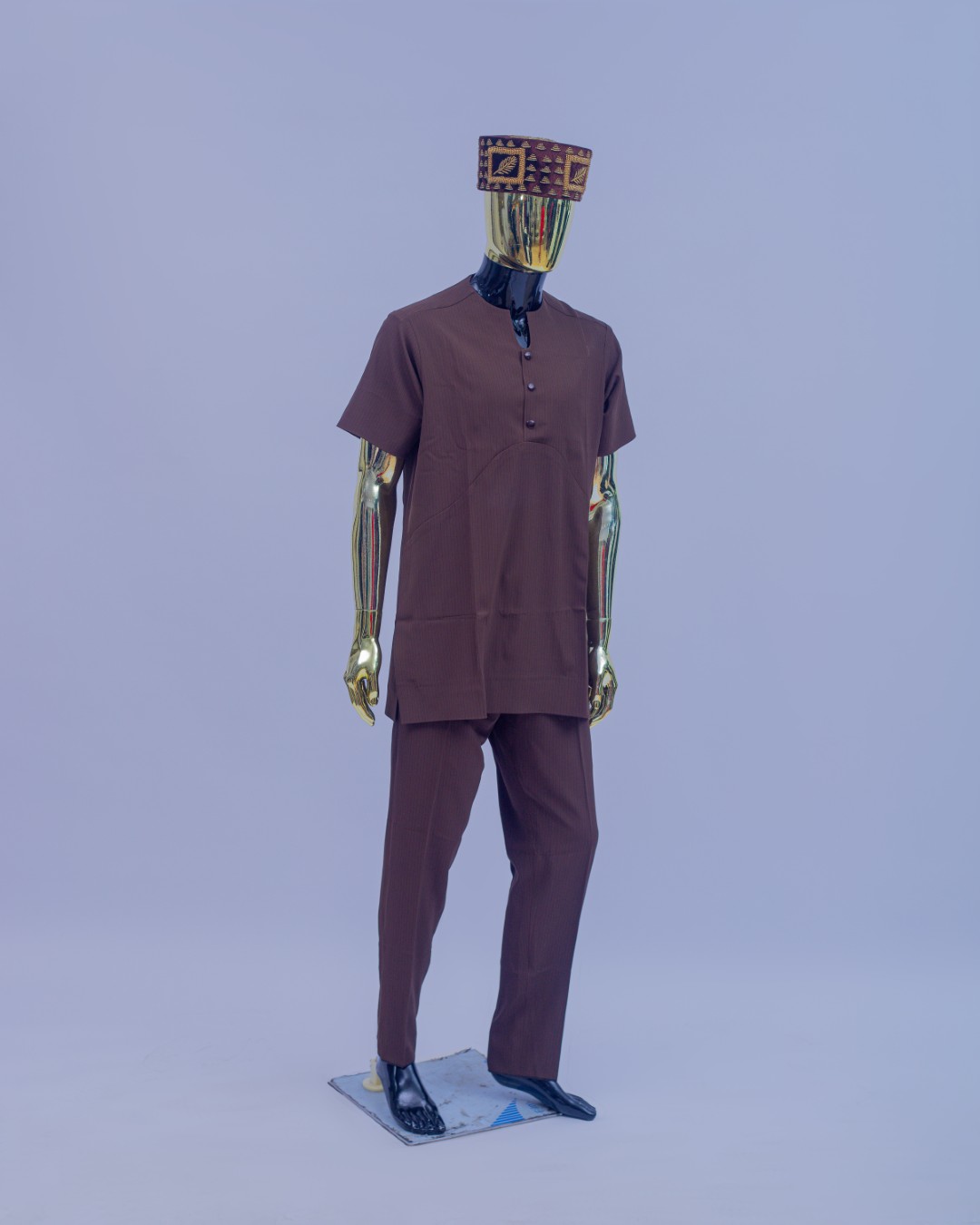 Chocolate Brown Men's Kaftan Set with Embellished Hat